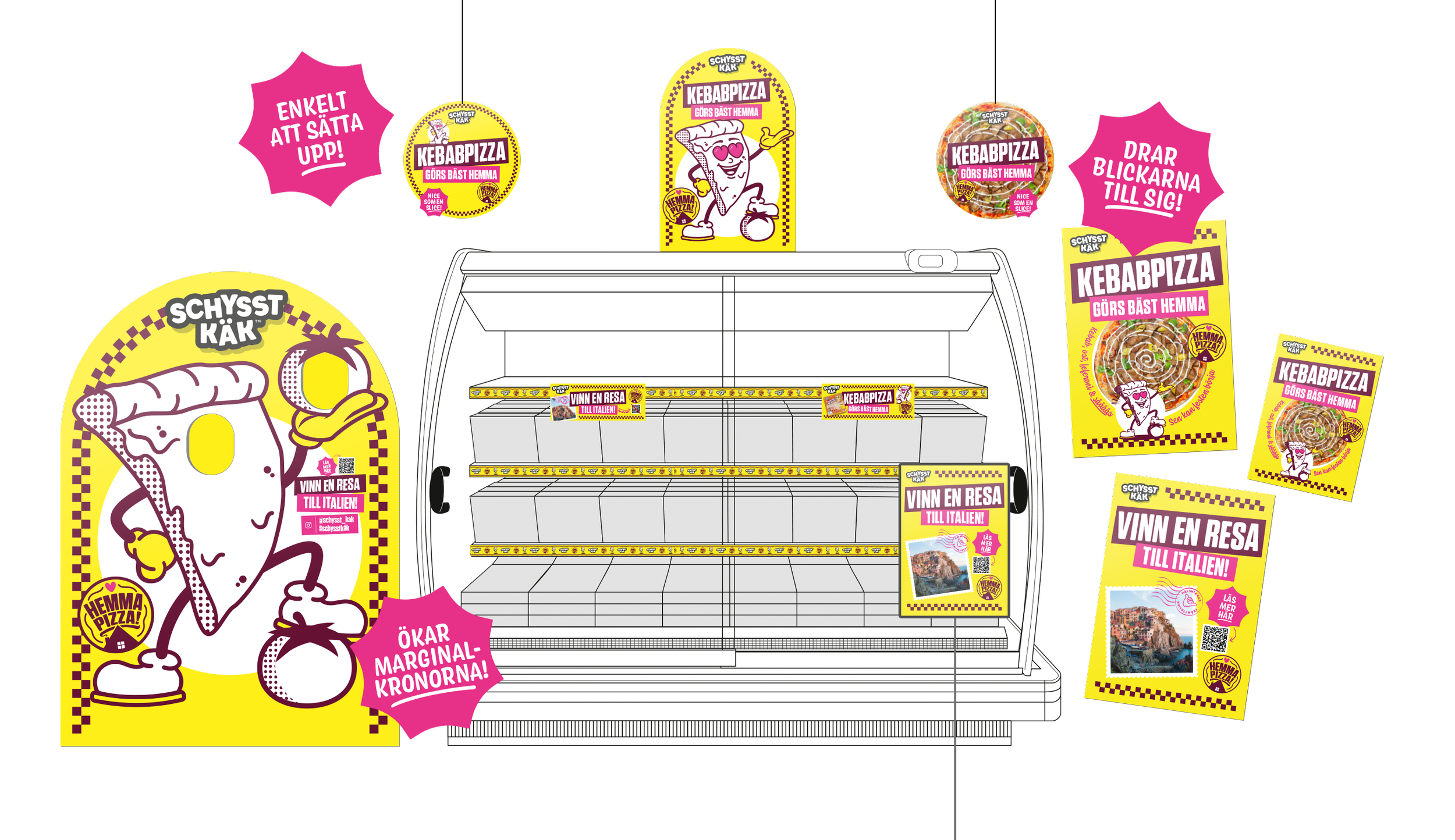 Vi har såklart fixat riktigt schysst skyltmaterial till din butik så att hemmapizzan blir ett blickfång i kundvarvet och ökar marginalkronorna – en pizzakväll driver även merförsäljning av läsk och snacks så har ni plats bredvid gaveln, fram med det också!